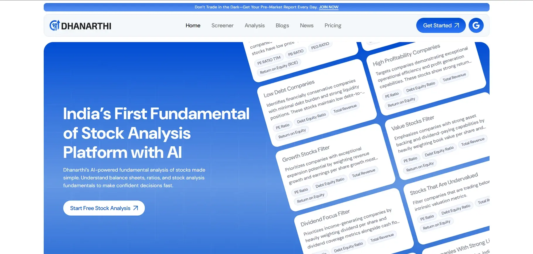Dhanarthi is one of the fundamental stock analysis platforms that helps everyone understand stock research conveniently. The Dhanarthi Screener turns complex financial reports into simpler data that can be easily understood.