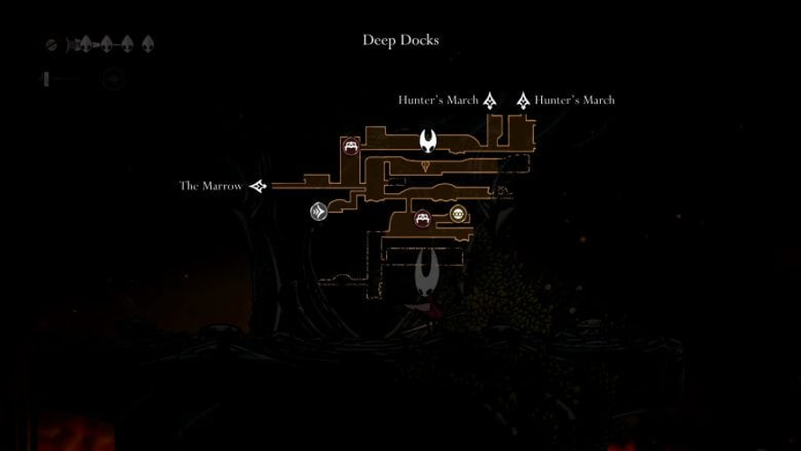Um die Fähigkeit „flinker Schritt“ zu erlangen, solltest du dich zunächst nach Osten durch den Bereich namens „Tiefenkai“ vorarbeiten. Dein erstes Ziel ist eine Kammer im Nordosten, die du durch einen Hebel erreichst. In der folgenden Kammer gilt es, nach Osten zu gehen und über die heiße Kohleoberfläche zu springen, um Verbrennungen zu vermeiden. Am Ende dieser Kammer kannst du auf Felsen springen und einen explosiven Kern zerstören, um den Weg zur nächsten Kammer freizuschalten. Dort befindet sich auch eine Bank, die du mit Rosenkranzperlen aktivieren kannst.