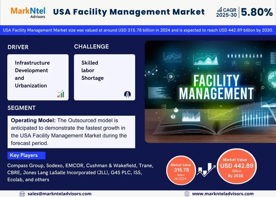 As per recent study by MarkNtel Advisors The USA Facility Management Market size was valued at around USD 315.78 billion in 2024 and is expected to reach USD 442.89 billion by 2030. Along with this, the market is estimated to grow at a CAGR of around 5.80% during the forecast period, i.e., 2025-30.