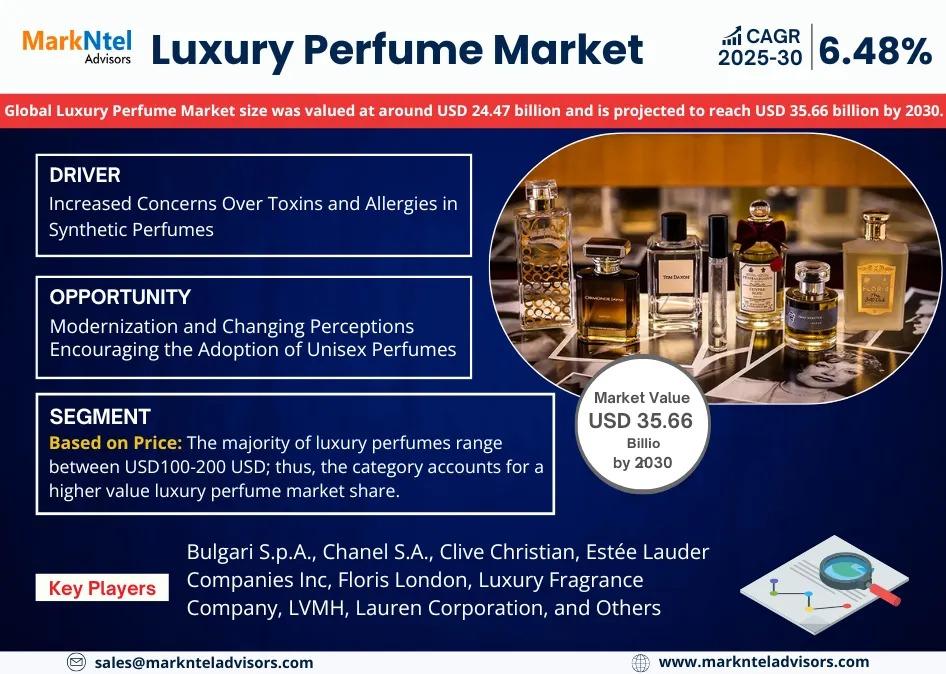 As per recent study by MarkNtel Advisors The Global Luxury Perfume Market size was valued at around USD 24.47 billion and is projected to reach USD 35.66 billion by 2030. Along with this, the market is estimated to grow at a CAGR of around 6.48% during the forecast period, i.e., 2025-30.