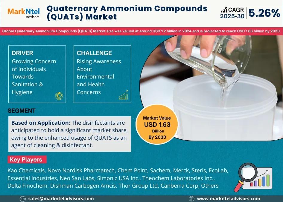 As per recent study by MarkNtel Advisors The Global Quaternary Ammonium Compounds (QUATs) Market size was valued at around USD 1.2 billion in 2024 and is projected to reach USD 1.63 billion by 2030. Along with this, the market is estimated to grow at a CAGR of around 5.26% during the forecast period, i.e., 2025-30.