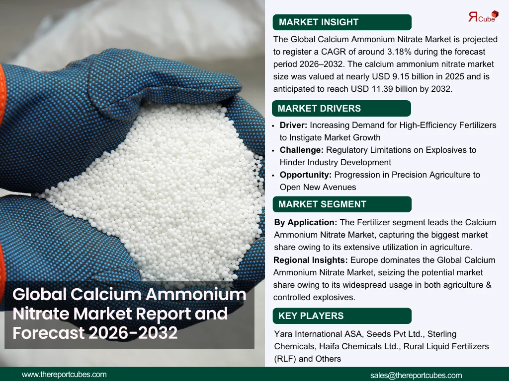 The Global Calcium Ammonium Nitrate Market is projected to register a CAGR of around 3.18% during the forecast period 2026–2032. The calcium ammonium nitrate market size was valued at nearly USD 9.15 billion in 2025 and is anticipated to reach USD 11.39 billion by 2032.