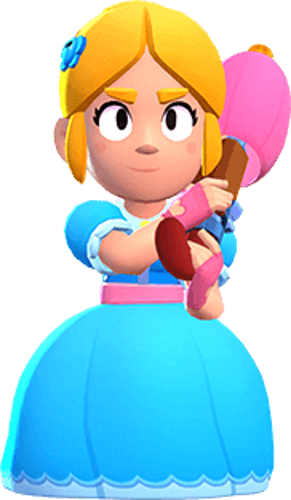 Piper excels as a ranged marksman, delivering increased damage the farther her shot travels, with a maximum of 3,000 damage at full range. Her attack reaches up to 7.5 tiles, matching Byron’s range, allowing her to strike from a safe distance. Her super ability involves soaring into the air on her umbrella and releasing four bombs beneath her, each capable of inflicting up to 1,600 damage in an area, making it an effective control tool.