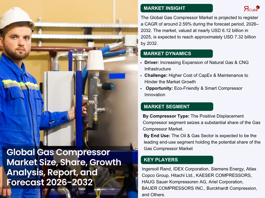 The Global Gas Compressor Market is projected to register a CAGR of around 2.59% during the forecast period, 2026–2032. The market, valued at nearly USD 6.12 billion in 2025, is expected to reach approximately USD 7.32 billion by 2032.