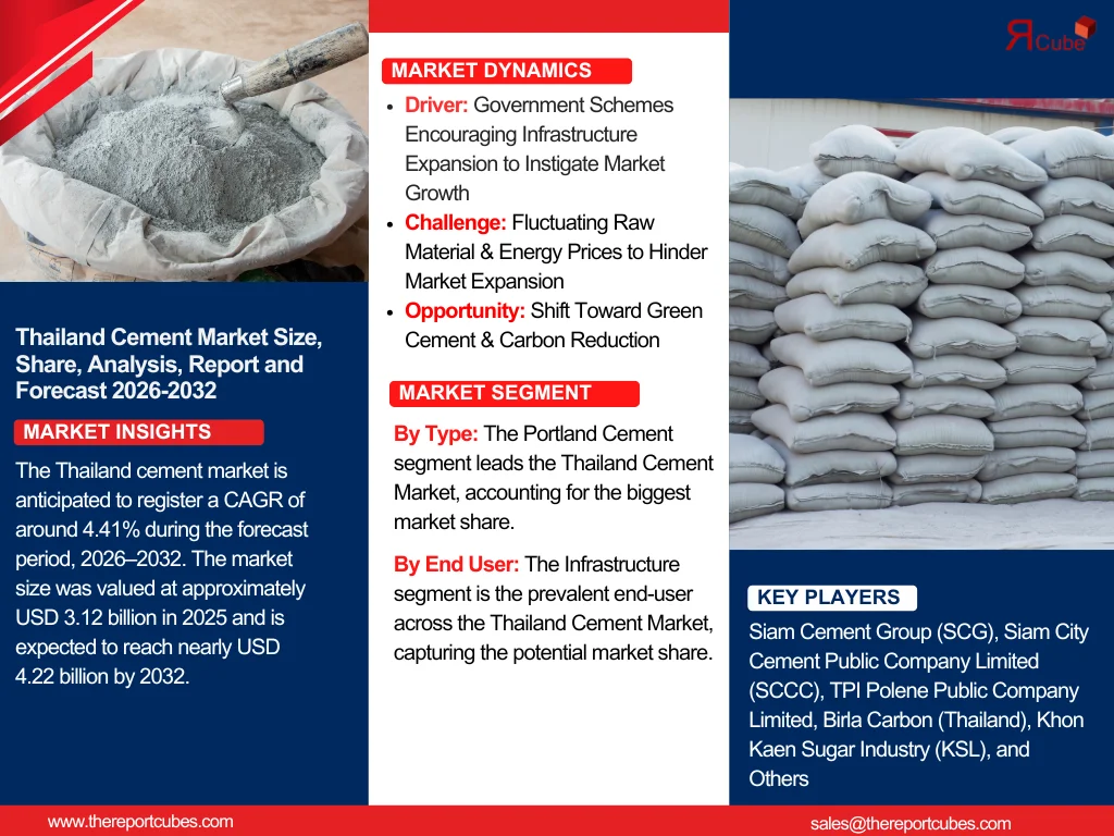 The Thailand cement market is anticipated to register a CAGR of around 4.41% during the forecast period, 2026–2032. The market size was valued at approximately USD 3.12 billion in 2025 and is expected to reach nearly USD 4.22 billion by 2032.