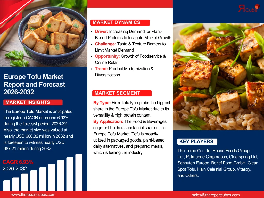The Europe Tofu Market is anticipated to register a CAGR of around 6.93% during the forecast period, 2026-32. Also, the market size was valued at nearly USD 660.32 million in 2025 and is foreseen to witness nearly USD 987.21 million during 2032.