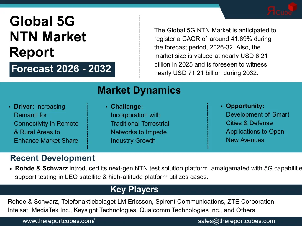 The Global 5G NTN Market is anticipated to register a CAGR of around 41.69% during the forecast period, 2026-32. Also, the market size is valued at nearly USD 6.21 billion in 2025 and is foreseen to witness nearly USD 71.21 billion during 2032.