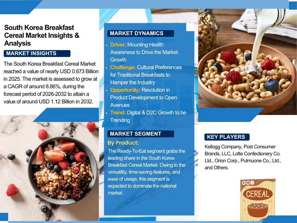 The South Korea Breakfast Cereal Market reached a value of nearly USD 0.673 Billion in 2025. The market is assessed to grow at a CAGR of around 8.86%, during the forecast period of 2026-2032 to attain a value of around USD 1.12 Billion in 2032.