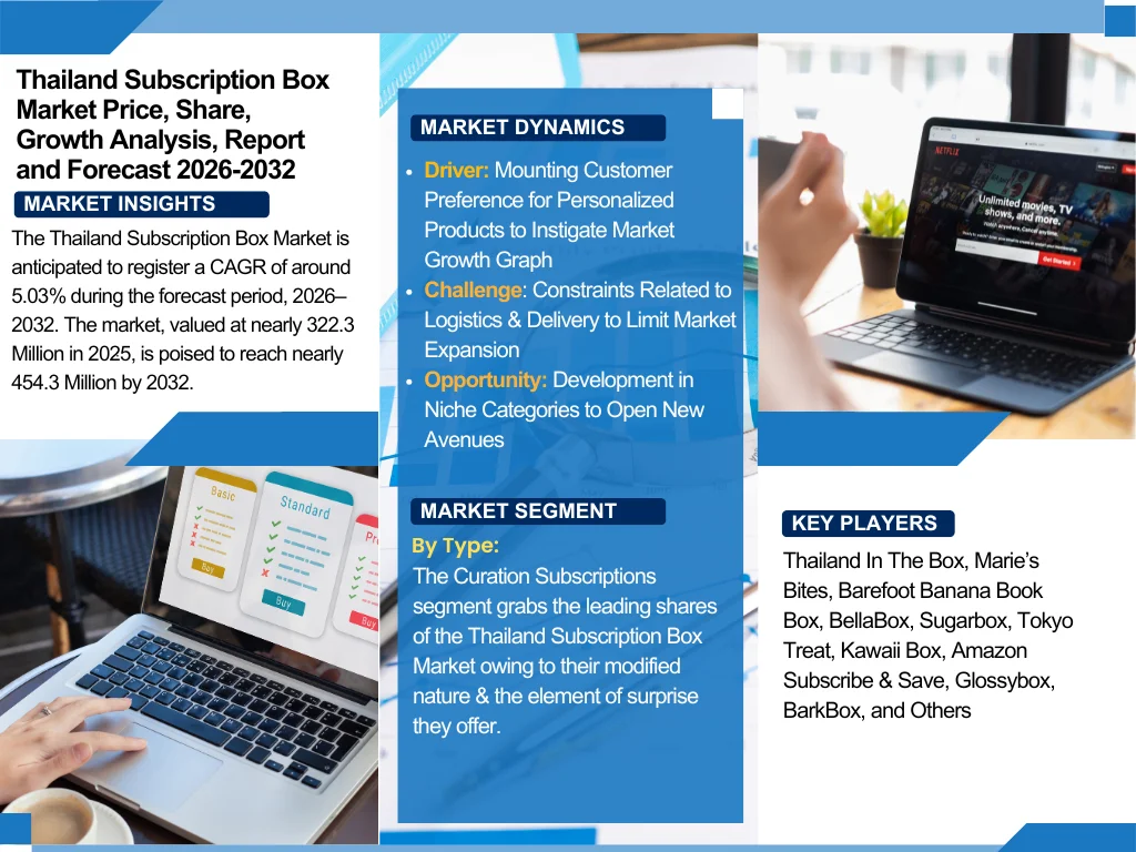 The credible Thailand Subscription Box Market report covers detailed insights into market size, share, trends, and opportunities. This research helps businesses make informed decisions, strengthen their strategies, and expand their reach in a competitive landscape. The analysis estimates market growth based on evolving dynamics and demand drivers.