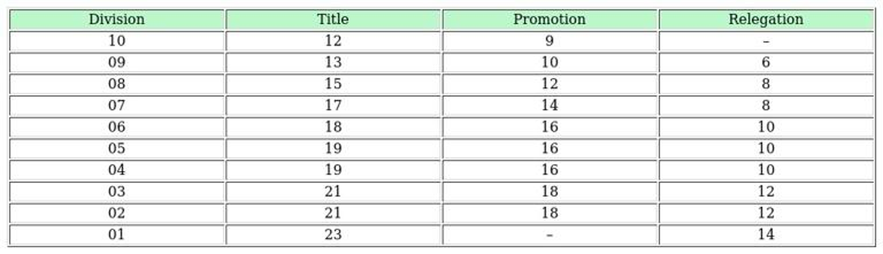 The divisions are organized from Division 10 (lowest) to Division 1 (highest), with each requiring a minimum number of points for promotion.
