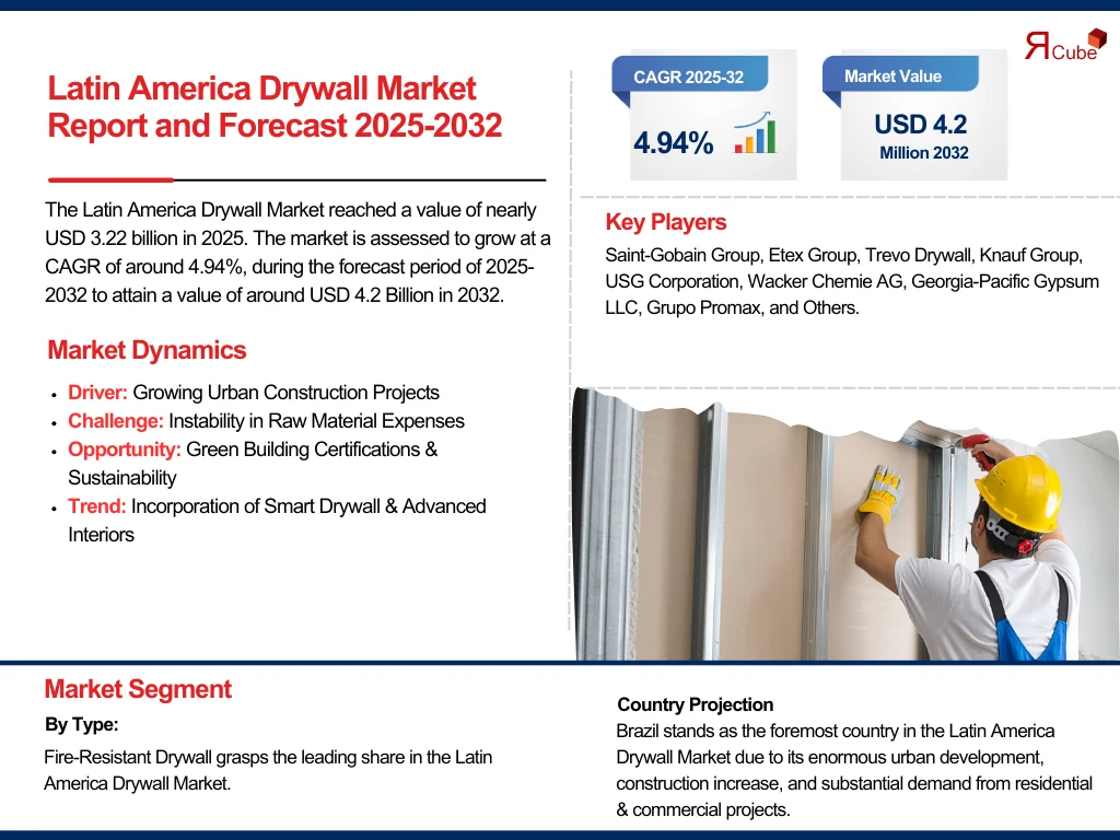 The Latin America Drywall Market reached a value of nearly USD 3.22 billion in 2025. The market is assessed to grow at a CAGR of around 4.94%, during the forecast period of 2025-2032 to attain a value of around USD 4.2 Billion in 2032.