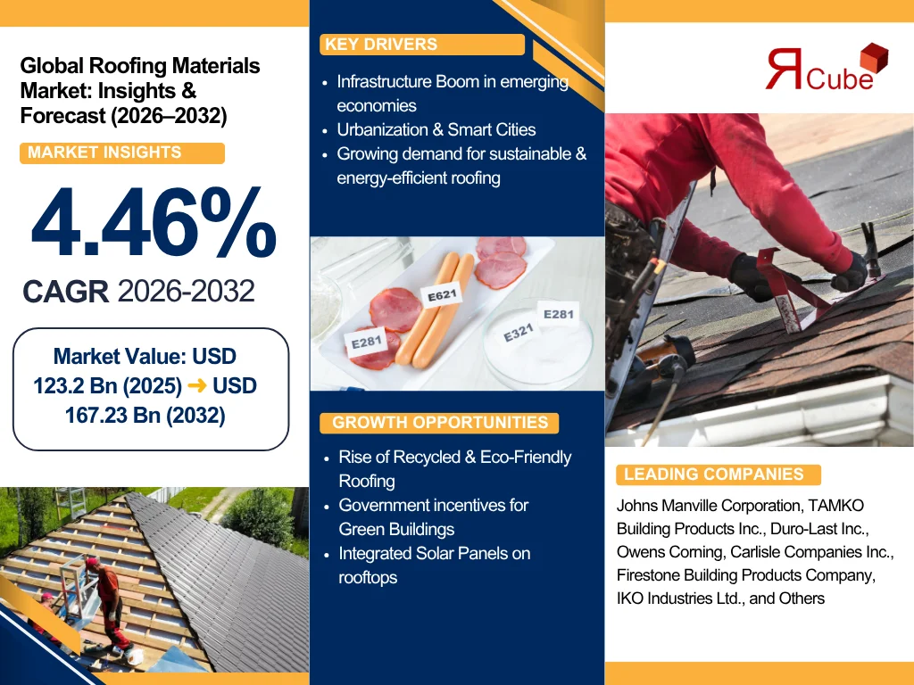 The Global Roofing Materials Market is anticipated to register a CAGR of around 4.46% during the forecast period 2026–32. The market is valued at approximately USD 123.2 billion in 2025 and is expected to reach nearly USD 167.23 billion by 2032.