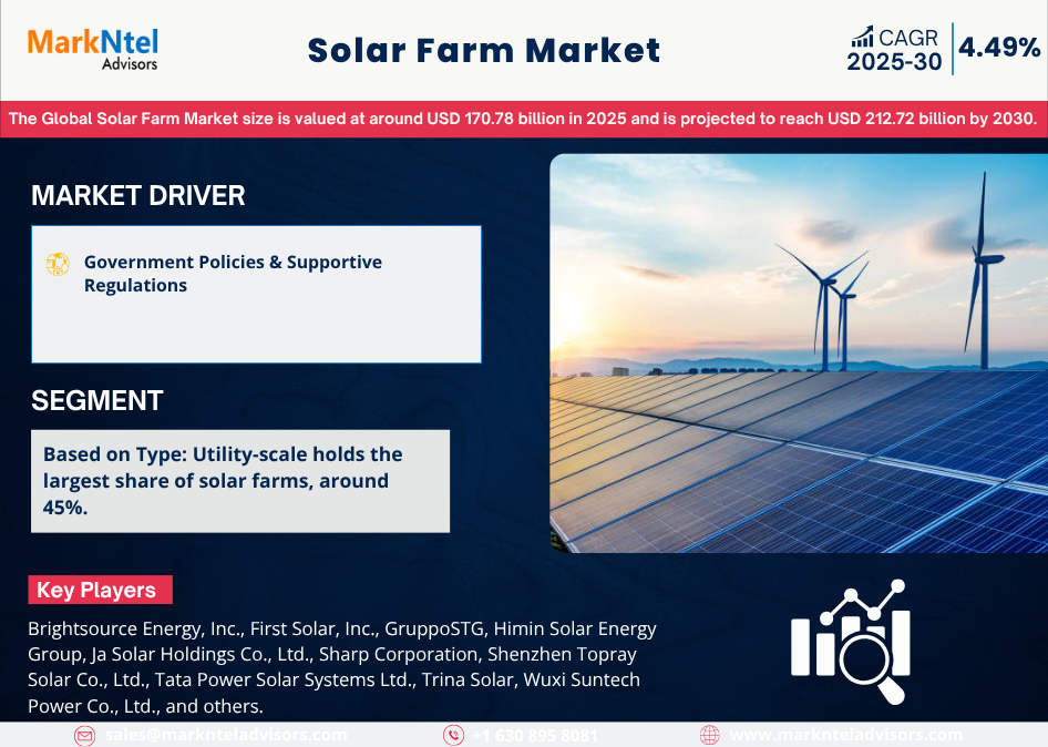 As per recent study by MarkNtel Advisors The The Global Solar Farm Market size is valued at around USD 170.78 billion in 2025 and is projected to reach USD 212.72 billion by 2030. Along with this, the market is estimated to grow at a CAGR of around 4.49% during the forecast period, i.e., 2025-30.