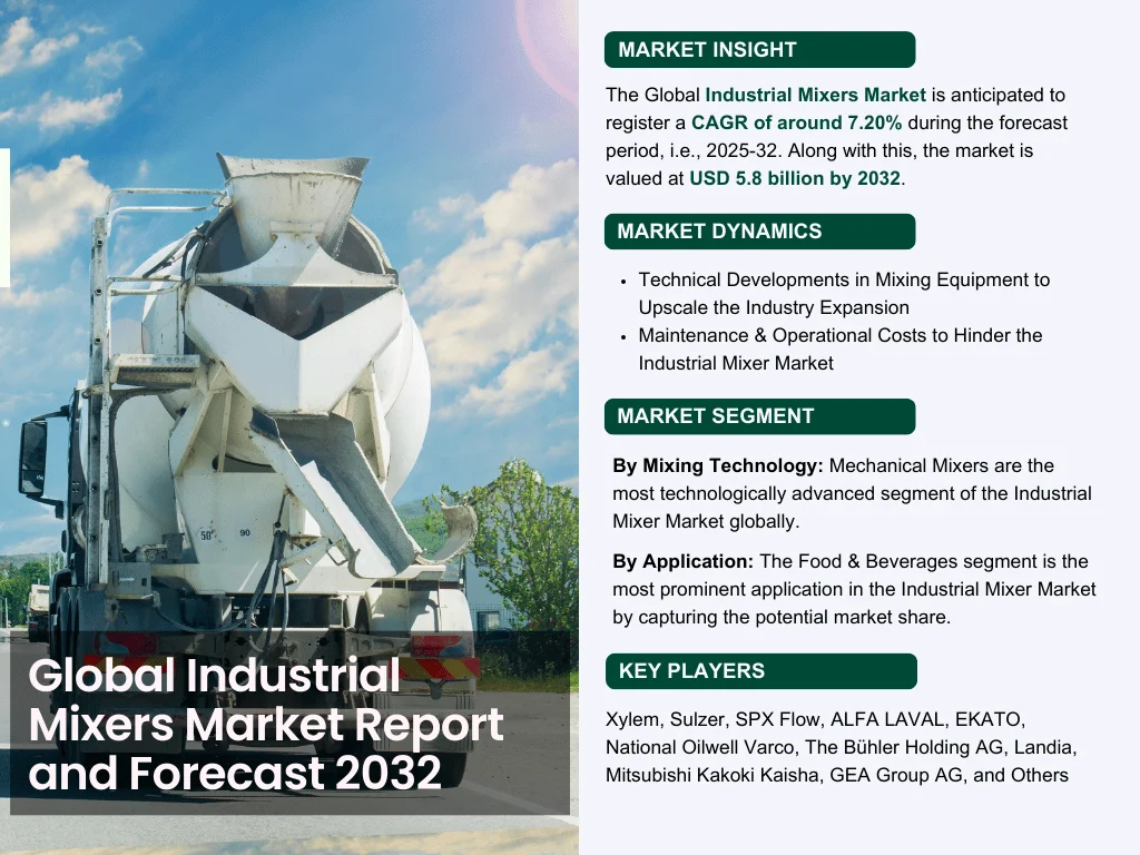 The Global Industrial Mixers Market is anticipated to register a CAGR of around 7.20% during the forecast period, i.e., 2025-32. Along with this, the market is valued at USD 5.8 billion by 2032.