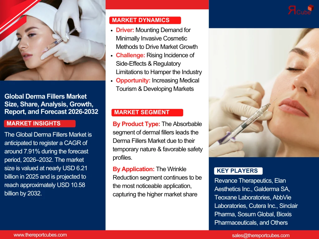 The Global Derma Fillers Market is anticipated to register a CAGR of around 7.91% during the forecast period, 2026–2032. The market size is valued at nearly USD 6.21 billion in 2025 and is projected to reach approximately USD 10.58 billion by 2032.