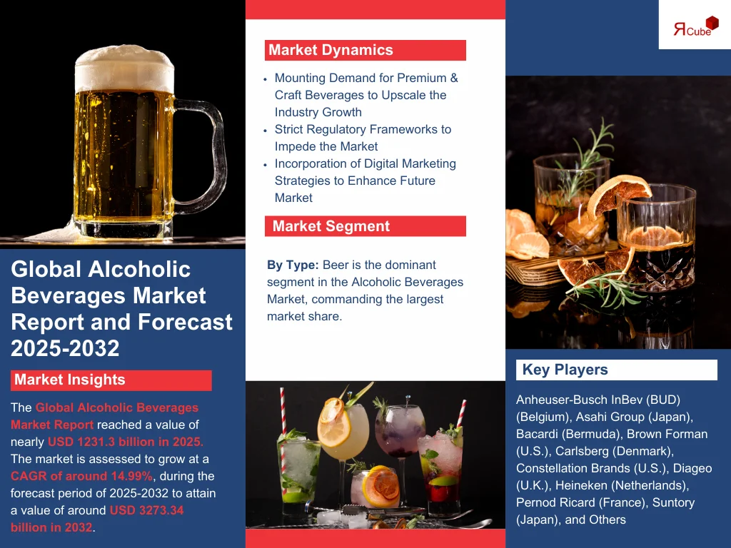 The Global Alcoholic Beverages Market reached a value of nearly USD 1231.3 billion in 2025. The market is assessed to grow at a CAGR of around 14.99%, during the forecast period of 2025-2032 to attain a value of around USD 3273.34 billion in 2032.