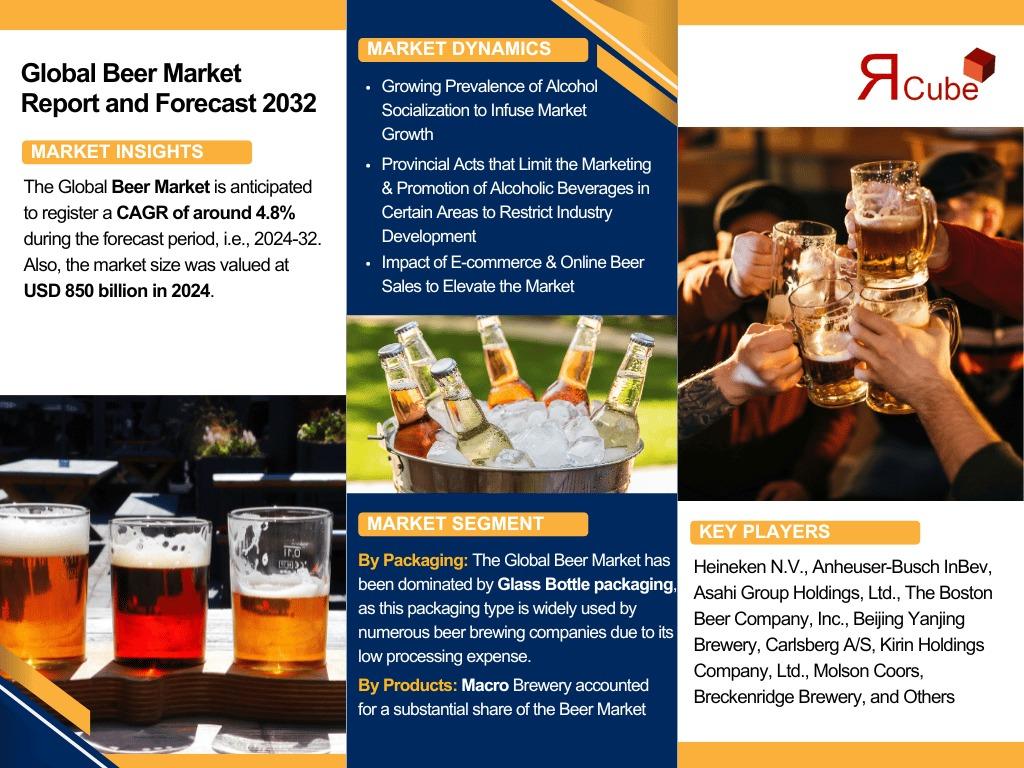 The Global Beer Market is anticipated to register a CAGR of around 4.8% during the forecast period, 2024–2032. The market size is valued at nearly USD 850 billion in 2025 and is expected to reach approximately USD 1236.83 billion by 2032.