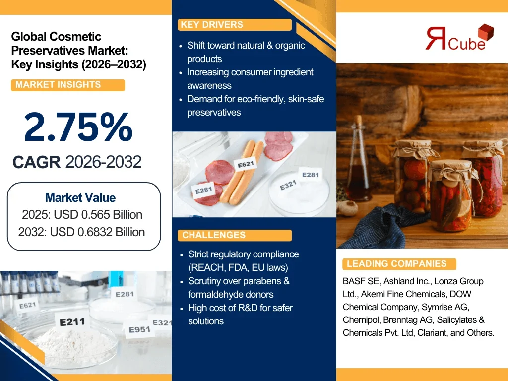 The Global Cosmetic Preservatives Market is anticipated to register a CAGR of around 2.75% during the forecast period, 2026–2032. The market is valued at approximately USD 0.565 billion in 2025 and is projected to reach USD 0.6832 billion by 2032.