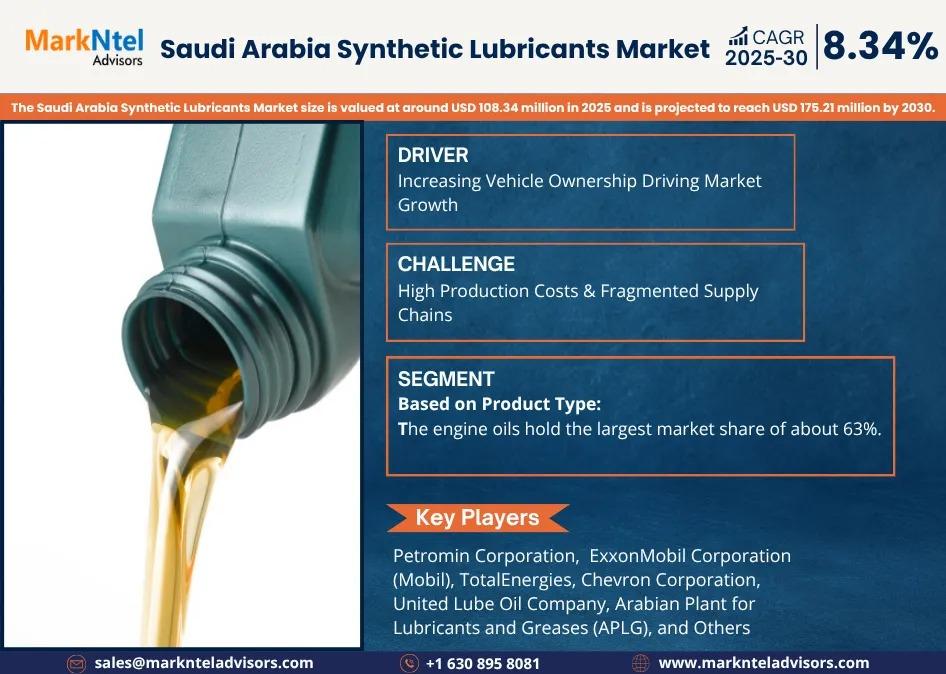 As per recent study by MarkNtel Advisors The Saudi Arabia Synthetic Lubricants Market size is valued at around USD 108.34 million in 2025 and is projected to reach USD 175.21 million by 2030. Along with this, the market is estimated to grow at a CAGR of around 8.34% during the forecast period, i.e., 2025-30.