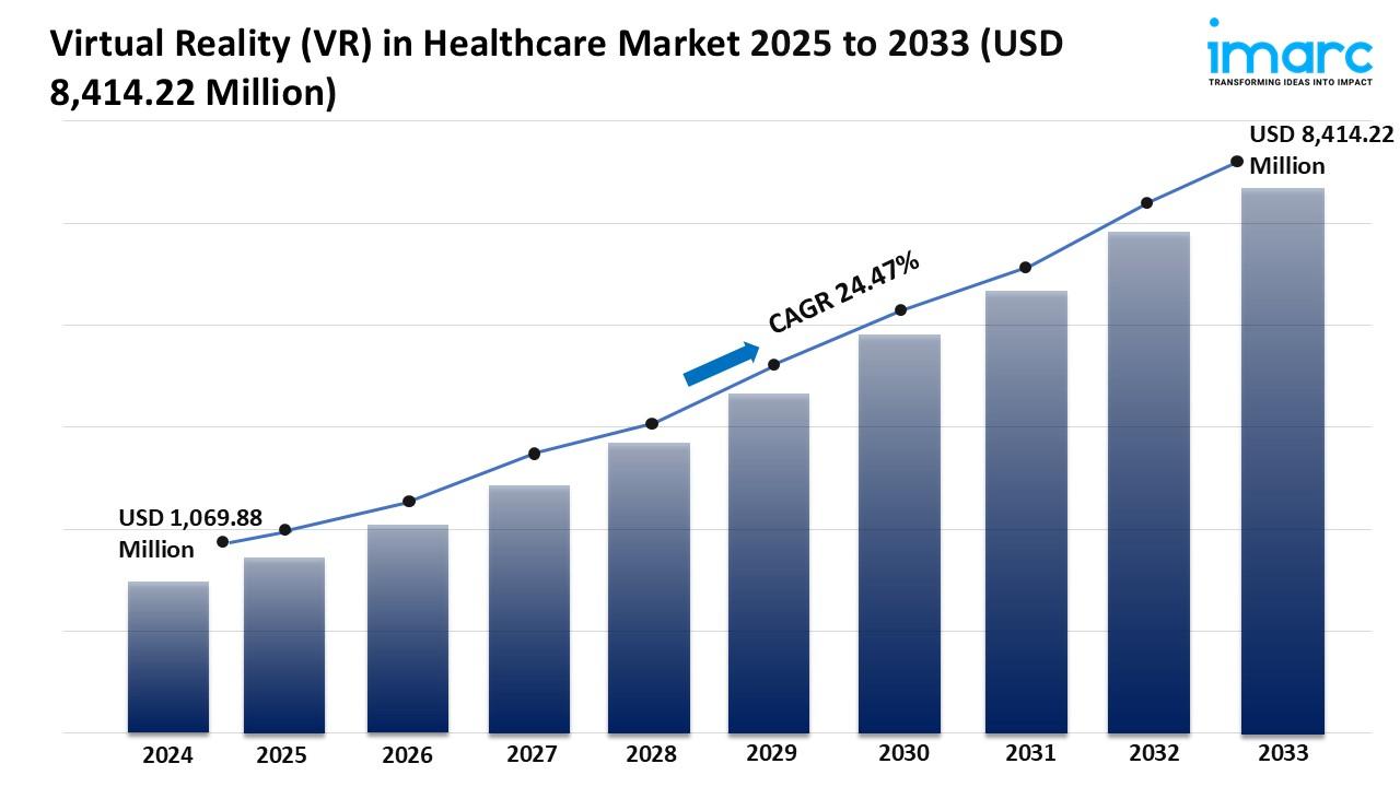 The virtual reality (VR) in healthcare market is experiencing rapid growth, driven by hurried demand for remote medical training, expanding global investment in VR healthcare startups, and progressive healthcare policies promoting VR adoption. According to IMARC Group's latest research publication, "Virtual Reality (VR) in Healthcare Market Size, Share, Trends and Forecast by Component, Technology, Product, Application, End User, and Region, 2025-2033" , the global virtual reality (VR) in healthcare market size was valued at USD 1,069.88 Million in 2024. Looking forward, IMARC Group estimates the market to reach USD 8,414.22 Million by 2033, exhibiting a CAGR of 24.47% from 2025-2033.