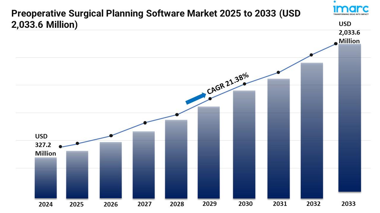 The Preoperative Surgical Planning Software Market is experiencing rapid expansion, driven by Rising Surgical Procedures, Growing Demand for Minimally Invasive Surgery and Technological Advancements. According to IMARC Group's latest research publication, "Preoperative Surgical Planning Software Market: Global Industry Trends, Share, Size, Growth, Opportunity and Forecast 2025–2033", The global preoperative surgical planning software market size reached USD 327.2 Million in 2024. Looking forward, the market is expected to reach USD 2,033.6 Million by 2033, exhibiting a growth rate (CAGR) of 21.38% during 2025-2033.