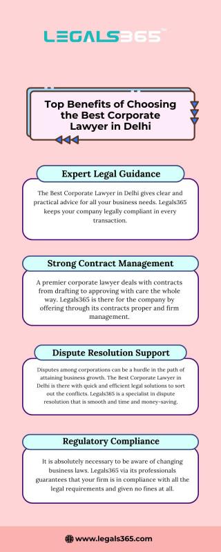 Top Benefits of Choosing the Best Corporate Lawyer in Delhi 1. Expert Legal Guidance The Best Corporate Lawyer in Delhi gives clear and practical advice for all your business needs. Legals365 keeps your company legally compliant in every transaction. 2. Strong Contract Management A premier corporate lawyer deals with contracts from drafting to approving with care the whole way. Legals365 is there for the company by offering through its contracts proper and firm management. 3. Dispute Resolution Support Disputes among corporations can be a hurdle in the path of attaining business growth. The Best Corporate Lawyer in Delhi is there with quick and efficient legal solutions to sort out the conflicts. Legals365 is a specialist in dispute resolution that is smooth and time and money-saving. 4. Regulatory Compliance It is absolutely necessary to be aware of changing business laws. Legals365 via its professionals guarantees that your firm is in compliance with all the legal requirements and given no fines at all. Select Legals365 for the Best Corporate Lawyer in Delhi as your trusted legal support and confidently secure the future of your business. Visit Here - https://www.legals365.com/corporate-lawyers-in-delhi/